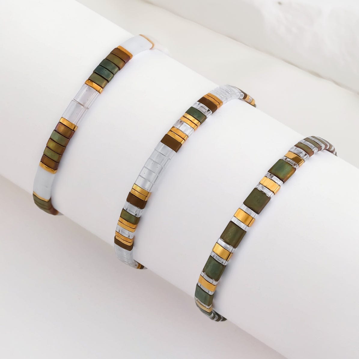 La parure Mila réunit trois bracelets extensibles faits main : Mila, Nara et Amaris, en perles japonaises Miyuki Tila.