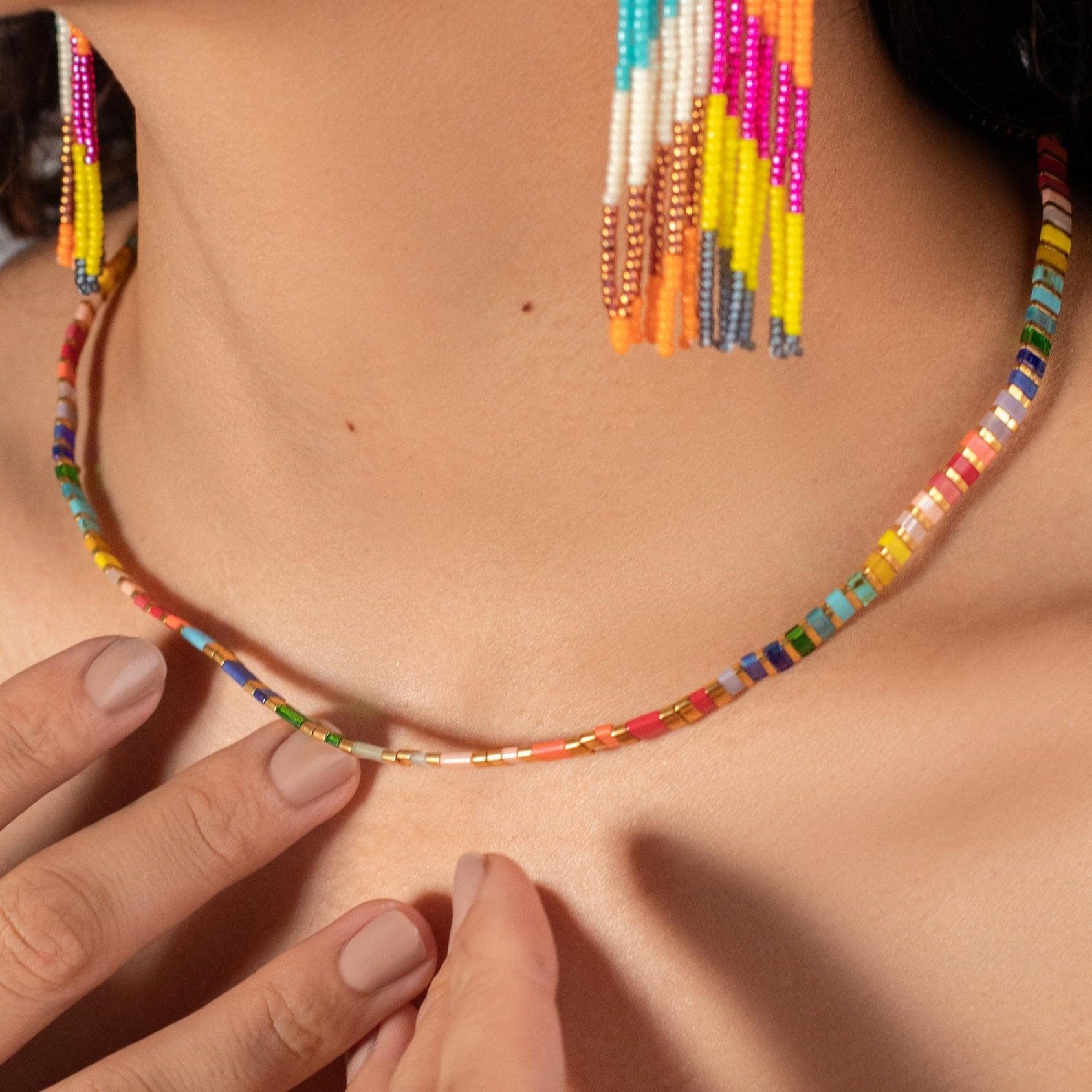 Ce nouveau collier unique Rainbøw de Køss Design est réalisé à partir de perles de verre du Japon. Il peut se porter soit ras du cou, soit plus allongé.