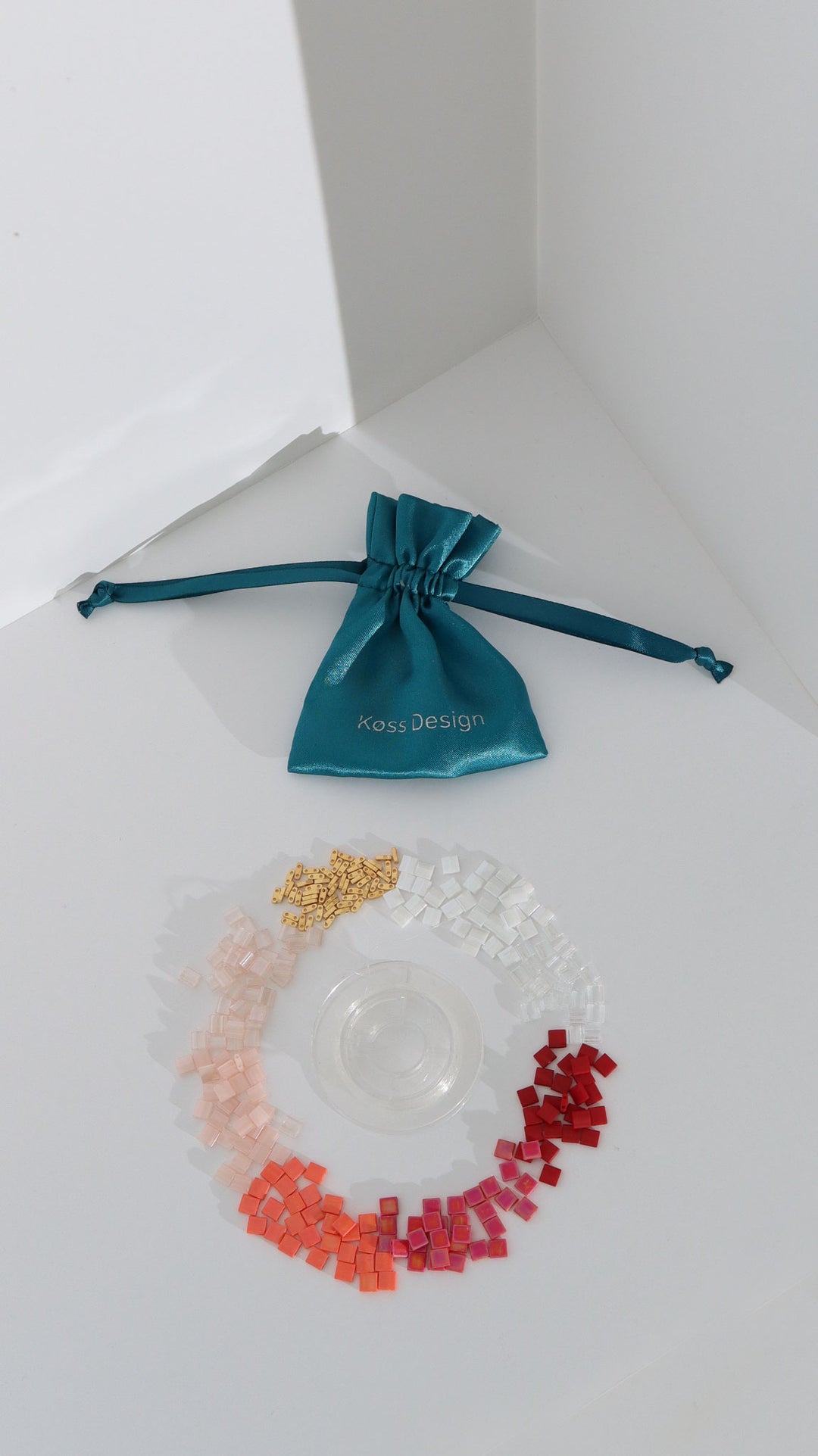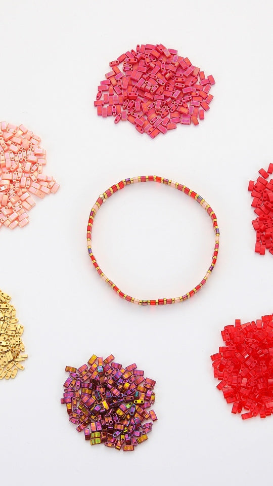 Una vez seleccionadas y compradas las cuentas, comienza el proceso de montaje. Su particular forma cuadrada de las cuentas japonesas Miyuki exige pericia para garantizar que las pulseras sean redondas en lugar de cuadradas.