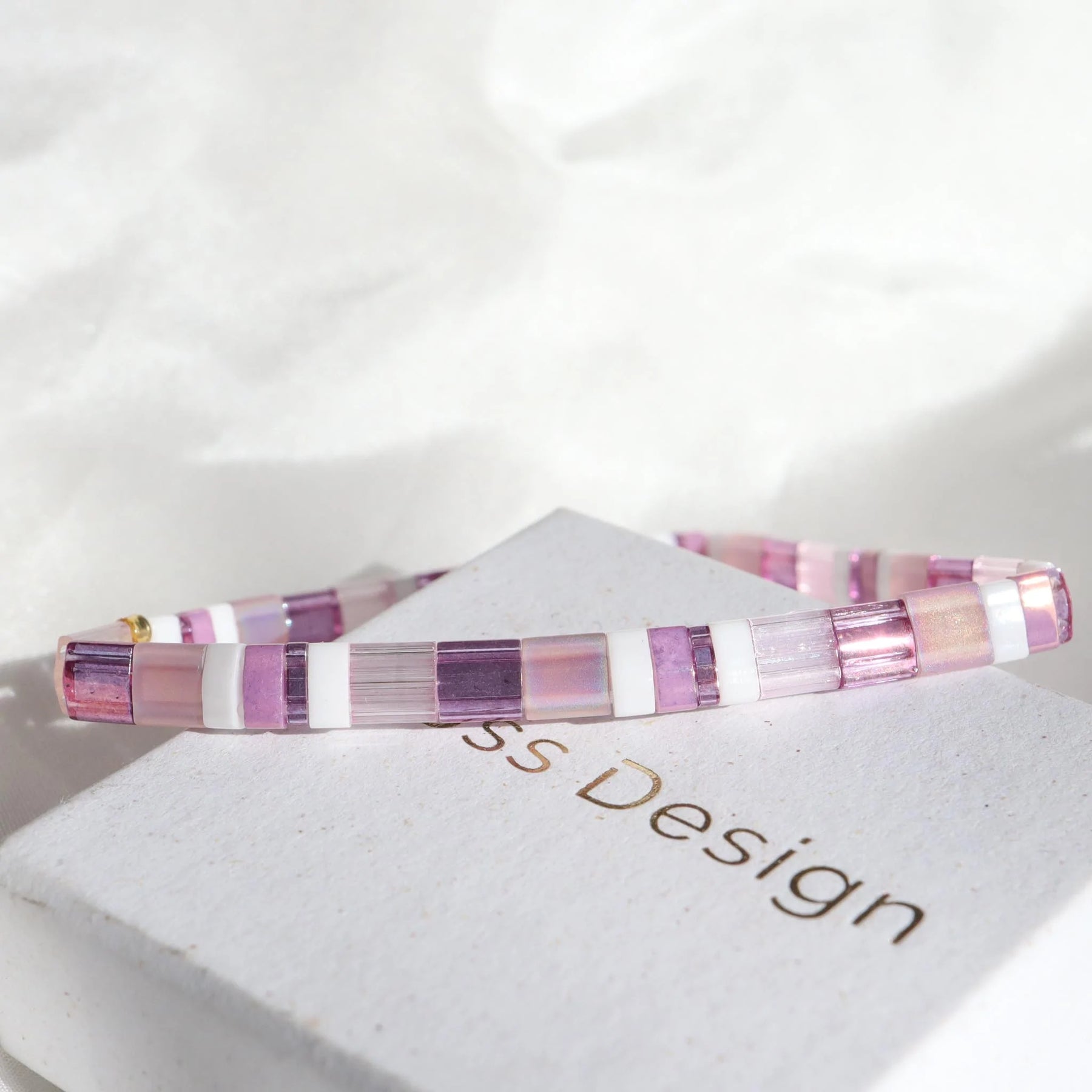 Este conjunto único de color lavanda de Køss Design contiene nuestras pulseras Lavanda & Violeta, hechas con piedras japonesas.