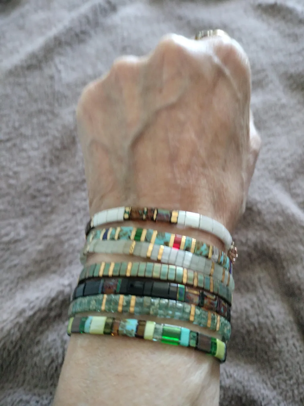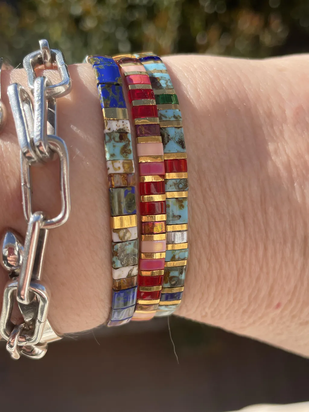 #PAQUESLa parure Lou associe les bracelets de perles plates Asa et Jola, confectionnés à la main avec des perles Miyuki du Japon, sélectionnées pour leur éclat subtil et leur qualité exceptionnelle.