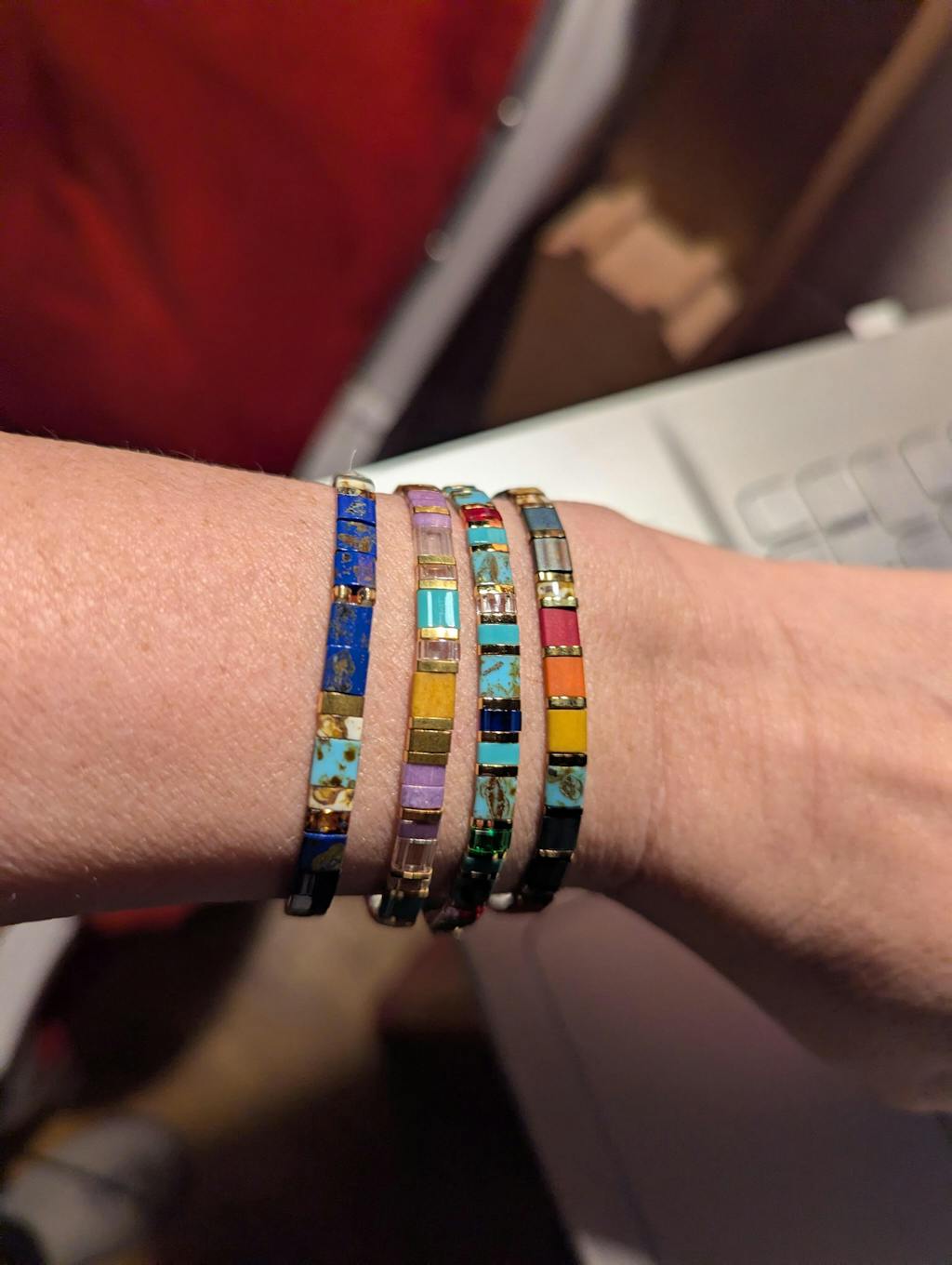 Chaleureuse et éclatante, elle illumine vos tenues avec ses nuances de rouge, de jaune moutarde, de turquoise et de touches dorées. Portée seule ou en accumulation avec d’autres bracelets en perles, elle ajoute une touche vibrante et raffinée à votre poignet.