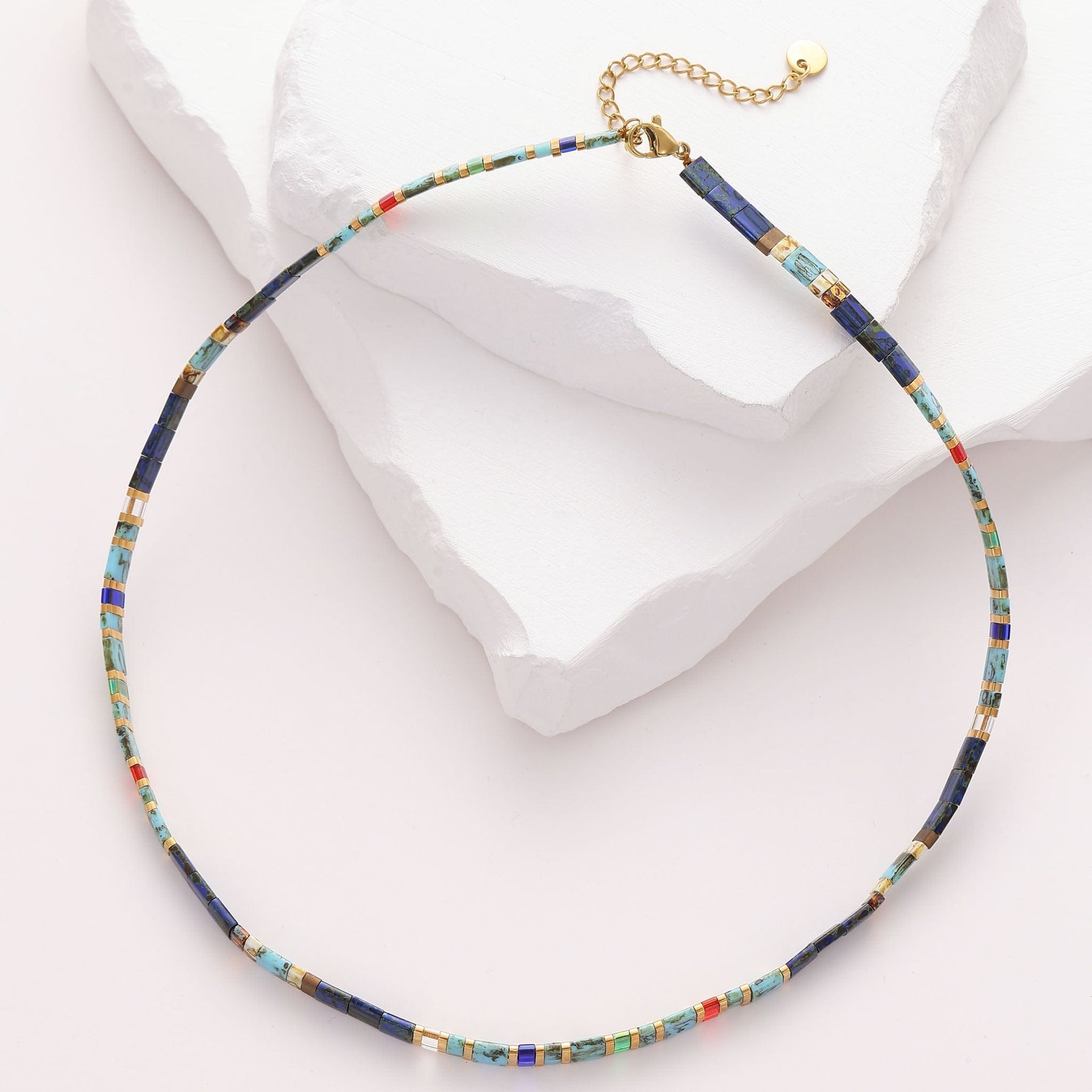 Ce nouveau collier unique Lou de Køss Design est réalisé à partir de perles de verre du Japon. Il peut se porter soit ras du cou, soit plus allongé.