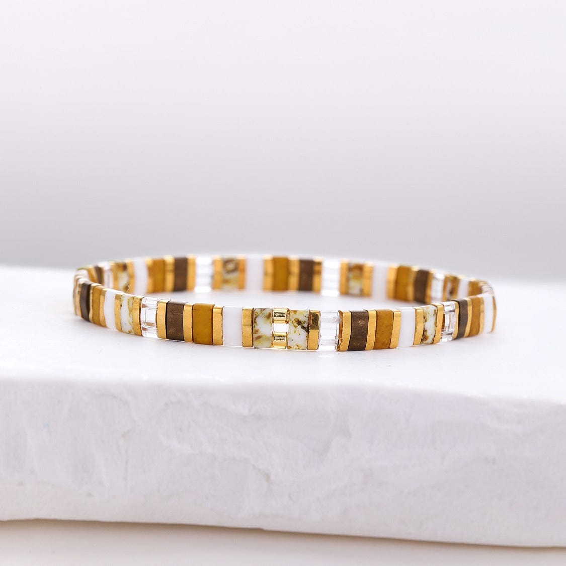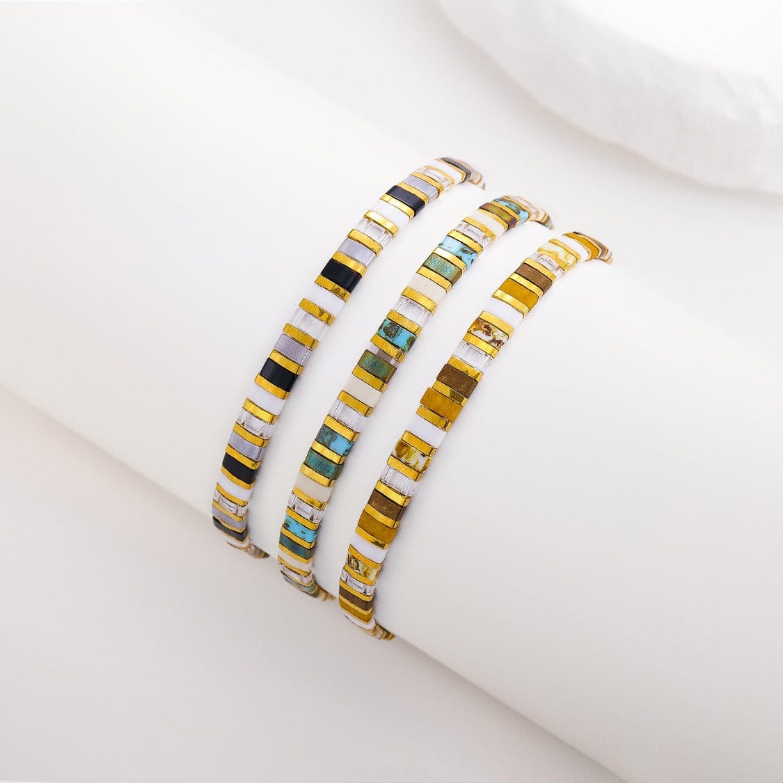 La parure Liana réunit trois bracelets de perles plates, réalisés à la main avec des perles Miyuki du Japon, reconnues dans le monde entier pour leur éclat et leur finesse.