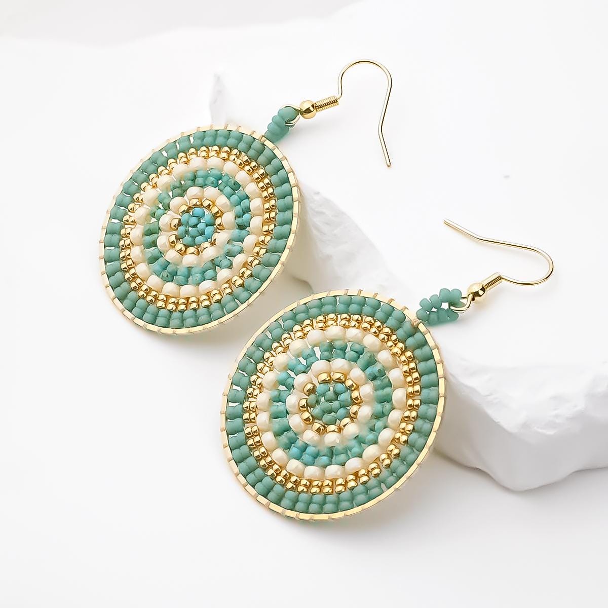 Les boucles Maris séduisent par leurs cercles concentriques de perles Miyuki du Japon, mêlant turquoise apaisant, ivoire nacré et or étincelant dans un motif mandala raffiné.