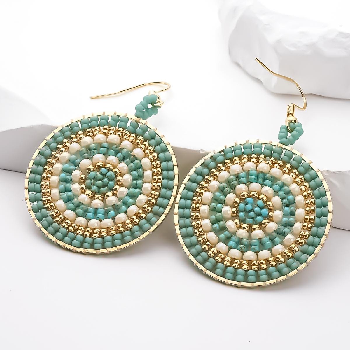 Los pendientes Maris cautivan por sus círculos concéntricos de cuentas Miyuki de Japón, combinando turquesa relajante, marfil nacarado y oro brillante en un refinado diseño de mandala.
